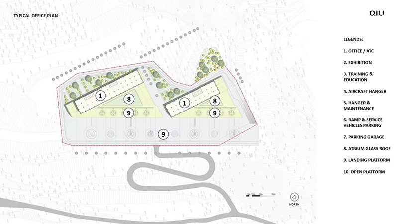 深圳作為全球頂尖科技城市,此無人機(jī)港位于深圳西北部,地形得天獨(dú)厚,座落陡峭山巔,大海和獨(dú)特的鹽田港在基地一覽無遺。此直升機(jī)兼載人無人機(jī)港占地 80,000 平方米,包括寬敞的機(jī)庫空間、長達(dá) 2,000 米的室外停機(jī)坪跑道、飛行控制中心、乘客休息室及住宿客房、研發(fā)辦公空間、飛行員培訓(xùn)中心、無人機(jī)博物館及 VIP 天空會(huì)所等機(jī)能一應(yīng)俱全。eVTOL 場地標(biāo)識(shí)設(shè)計(jì) ? QIUQuality Innovation United (QIU):