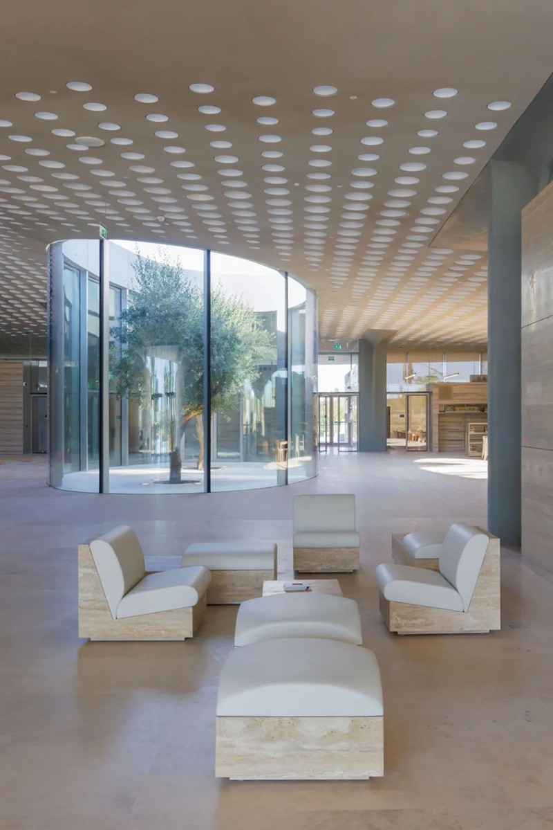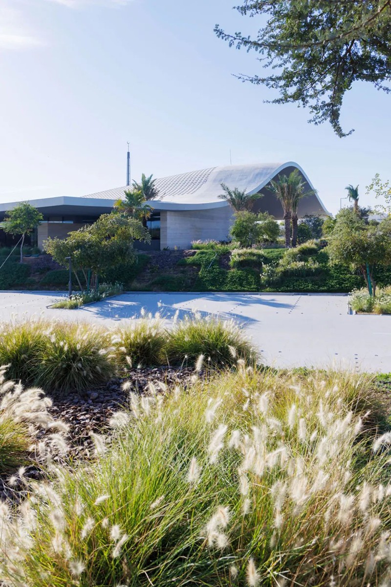 建筑的波浪形屋頂象征女性持續(xù)向上、自我成長(zhǎng)的力量。兩棵橄欖樹(shù)穿過(guò)屋頂結(jié)構(gòu)、向天而立,寓意和平與生命的延續(xù)。室內(nèi)外空間通過(guò)庭院與花園過(guò)渡連接,強(qiáng)化了人與自然的精神交匯,為來(lái)訪者提供安靜冥想與社區(qū)互動(dòng)的可能。